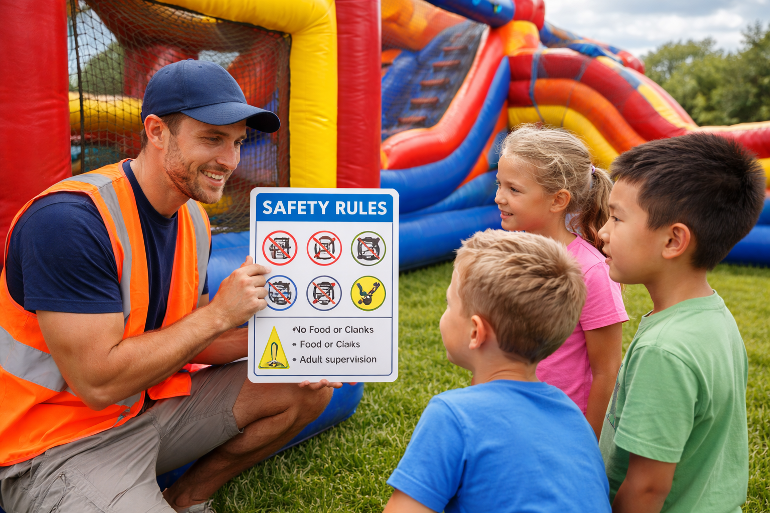 Safety is always a priority. Our inflatables are made from durable, commercial-grade materials and are inspected before every rental. Each unit is thoroughly cleaned and sanitized prior to delivery, and proper anchoring is used to ensure a stable, secure setup.
